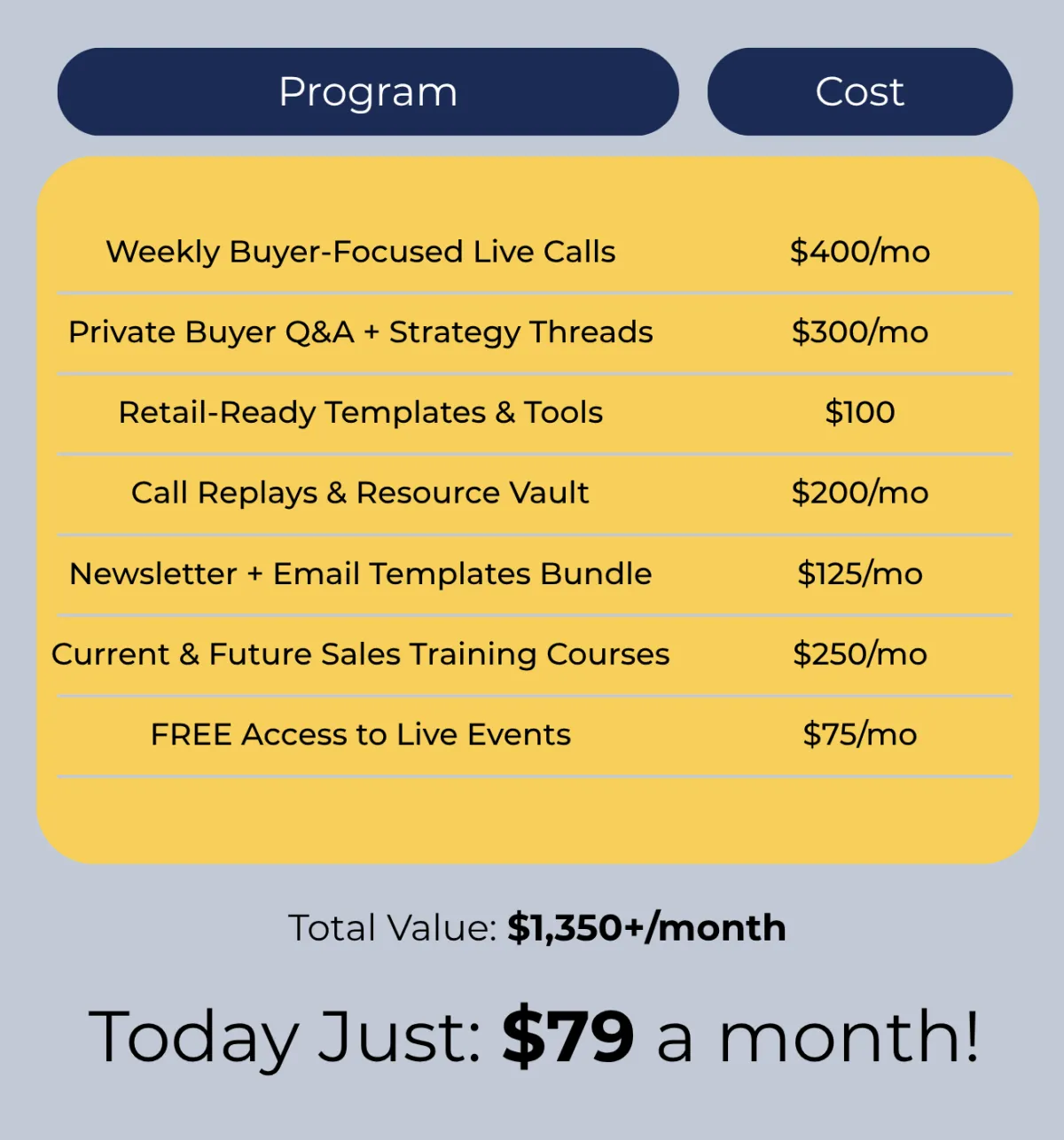 You get weekly live calls, expert resources, private coaching threads, and real buyer insights — all for less than the cost of one lost opportunity.